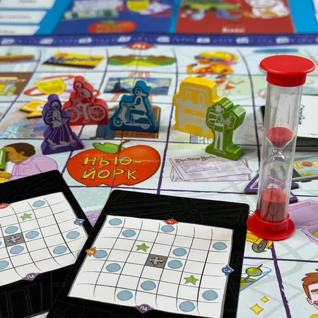 карточки, фишки, 5 паспортов, песочные часы, правила