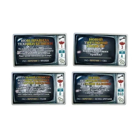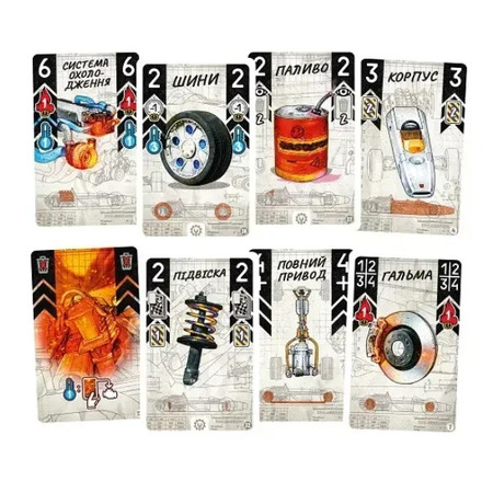 У коробці на вас чекають чотири поля з трасами, безліч карток, фішки у вигляді машинок і все, що потрібно для захоплюючого протистояння, включаючи можливість налаштування погоди та кастомізації боліда. Покращуйте автомобілі, контролюйте швидкість і ставайте справжньою легендою траси, змушуючи супротивників заздрісно дивитися вам навздогін.