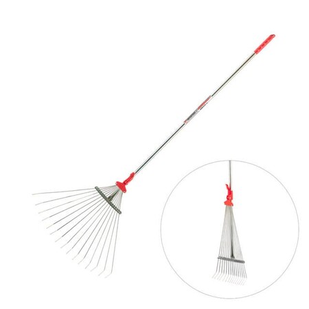 Ця модель граблів виготовлена з надійної високоякісної міцної оцинкованої сталі, стійкої до корозії. Віялові граблі мають зручну довгу металеву ручку. Ширина віяла регулюється в діапазоні від 200 до 650 мм, що дозволяє налаштувати оптимальну ширину обробки, залежно від типу поверхні та забруднення.