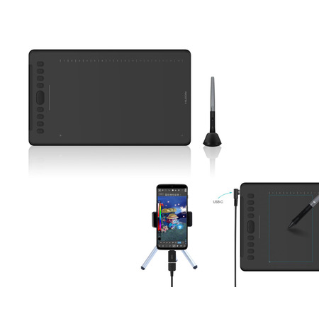 Розроблений для професійної роботи, даний графічний планшет має активну зону 279.4 x 174.6 мм для комп'ютерів та ноутбуків та 174.6 x 109.1 мм для мобільних пристроїв з Android, що є універсальним та оптимальним розміром робочої поверхні, оскільки він максимально наближений до формату А4, що забезпечує більш природне малювання. З H1161 ви можете підключатися до будь-якого пристрою Android для створення нових робіт на телефоні або планшеті, використовуючи різні програми.