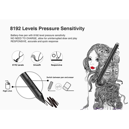 Цифрове перо пасивне, не потребує зарядки і має рівень чутливості 8192 тисків. Відсутність необхідності заряджання стілус дозволяє малювати в будь-який час, грати швидко, плавно. На панелі пера розміщено дві клавіші, де одна налаштована на праву клавішу миші, друга на перемикання між пером та гумкою.