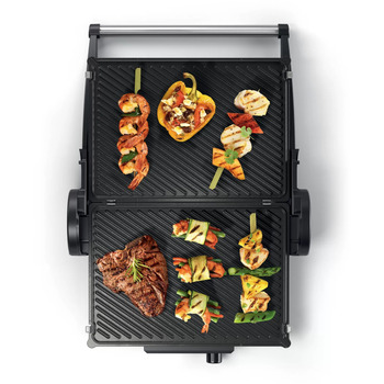 Корисні та смачні страви завдяки трьом позиціям контактного гриля, які відкривають практично безмежні можливості втілення в життя творчих ідей на кухні. Закритий, як контактний гриль, відкритий, як настільний гриль та з режимом "верхнє та нижнє нагрівання" - для смаження, запікання, гратинування або нагрівання. Готуйте соковиті стейки, смачні гамбургери, тости, паніні, бутерброди або фокаччо - насолоджуйтесь тим, що вам подобається. Смачно, низькокалорійно та корисно.