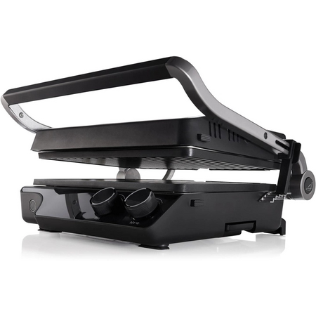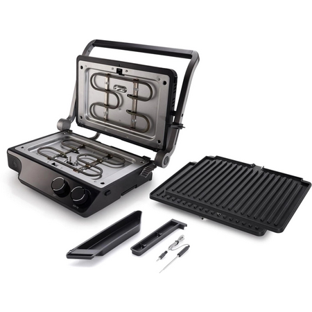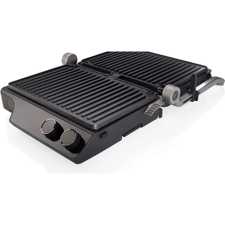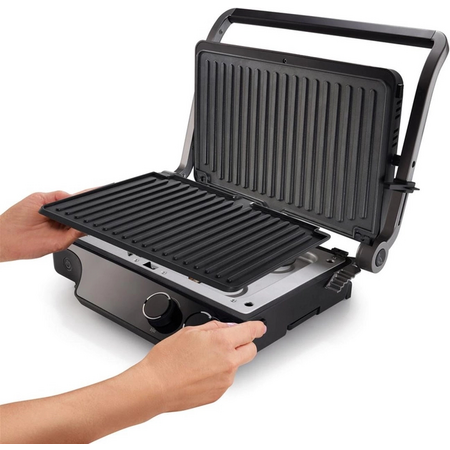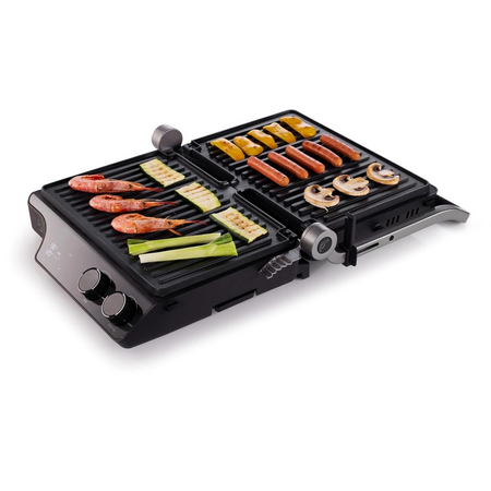 Знімні профільовані пластини підходять для приготування улюбленого гриль-м'яса, ковбасок, риби, гарнірів, овочів, а також для запікання коржів або паніні. За ними легко доглядати, оскільки вони мають антипригарне покриття і їх можна легко мити в посудомийній машині. Плити для гриля оснащені нагрівальними спіралі, які забезпечують швидкий нагрів і ретельний розподіл тепла. Розмір однієї зони гриля дуже великий; 34 × 23 см, і ви зможете легко приготувати на грилі 6 великих тостів за один раз.