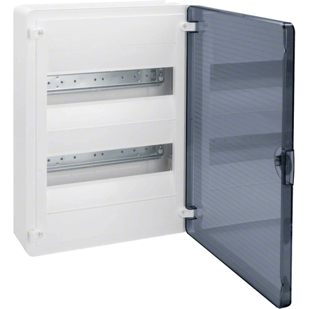 Розподільний щиток Хагер Гольф накладної установки з прозорими дверцятами, для пристроїв глибиною до 70 мм. Щиток із пластмаси. Встановлення дверцят праворуч або ліворуч, без демонтажу кришки; замок та ключі не входять до комплектації. Дверцята на 180°.