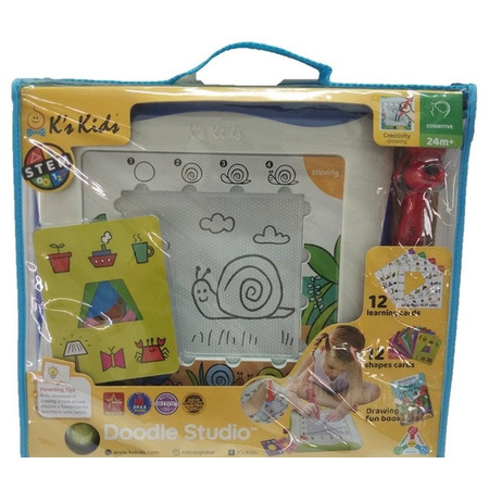 Магнітна дошка для малювання, 12 карток у вигляді двосторонніх шаблонів, 12 двосторонніх шаблонів із завданнями на логіку, книга з покроковою інструкцією для навчання малюванню і зручна ручка з мордочкою собаки Патрика