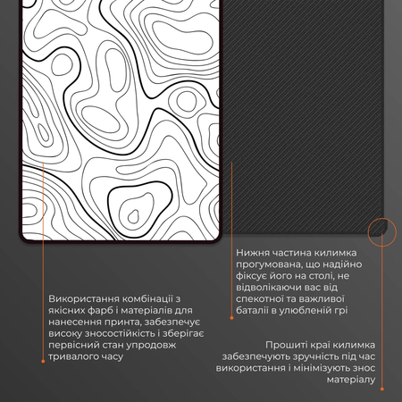 Стриманий, стильний дизайн гармонійно доповнює будь-яке ігрове місце, а оптимальні розміри забезпечують комфортну робочу площу як для професійного гравця, так і для щоденного використання. Цей килимок — вибір тих, хто прагне до найвищих результатів і не зупиняється на досягнутому.