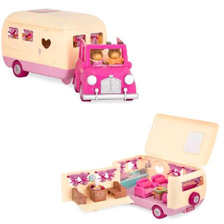 Настав час вирушити в дорогу для літніх канікул та відпочинку, а цей веселий яскраво-рожевий кабріолет і автопричіп - саме те, що потрібно для сімейки Li'l Woodzeez. У комплект входить повністю завантажений трейлер з усіма домашніми зручностями, а саме: вбудована кухня з різноманітним кухонним приладдям, зона для обіду зі стільцями та столиком, диванчик та крісла тощо. Крім того, трейлер відкривається, щоб показати всі чудові аксесуари всередині і полегшити дітям доступ всередину. У кабіні машини вміщується 2 фігурки, ще 2 можна посадити в причіп. Усі елементи набору неймовірно деталізовані та яскраві, що обов’язково сподобається малечі. Розмір ігрового набору в упаковці: 32 х 18 х 34 см. Рекомендовано для дітей від 3-х років.