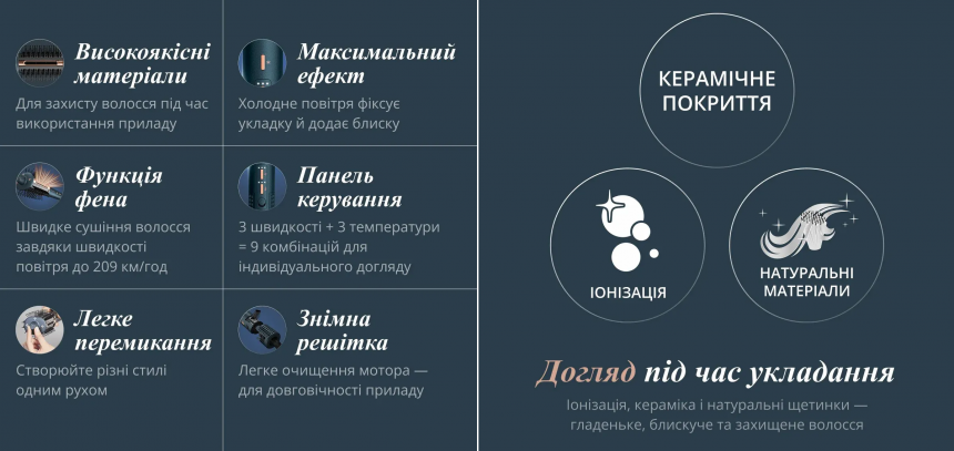 - Іонізація + керамічне покриття: зменшує статичну електрику, робить волосся гладким, блискучим і слухняним.