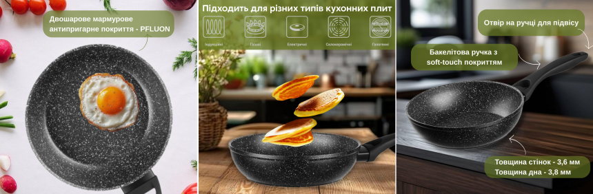 Сковороди чорного кольору виготовлено з алюмінію, вони мають мармурове протипригарне покриття та термостійке бакелітове руків’я. Сумісні з усіма видами плит, включно з індукційними, та придатні для миття в посудомийній машині.
