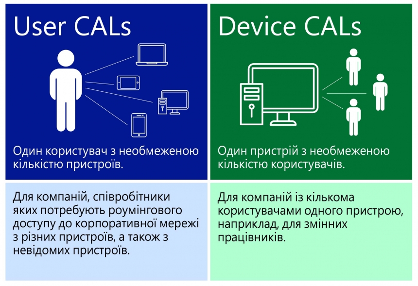 Варто враховувати, що CAL відрізняються від серверних ліцензій. Ліцензія клієнтського доступу (Client Access License) дає право користувачам або пристроям підключатися до сервера з інстальованим серверним ПЗ Microsoft.
