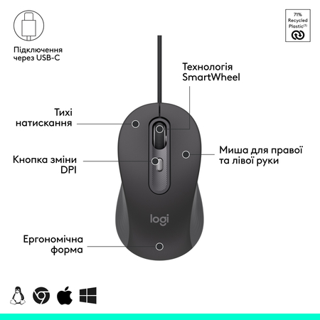 Миша з технологією SmartWheel автоматично перемикається між режимами точного та швидкого прокручування залежно від вашого завдання. Спеціальна конструкція робить її зручною як для правші, так і для лівші, а кнопка DPI дозволяє швидко регулювати чутливість відповідно до ваших потреб. За допомогою платформи Logi Tune / Options+ ви можете налаштувати клавіші дій відповідно до ваших унікальних робочих потреб, покращивши робочий процес та заощаджуючи цінний час.