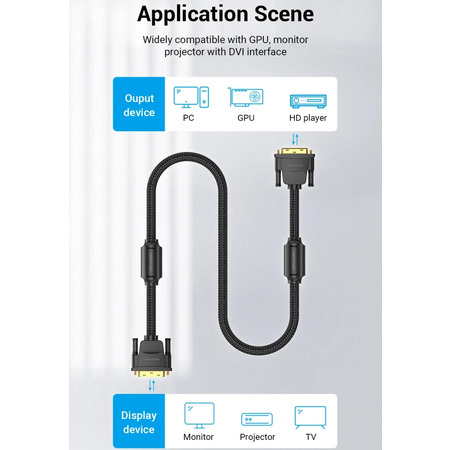 Кабель DVI-D 24M - 24M, 8.0 м, 2K 60Hz від Vention - це високоякісний кабель, який ідеально підходить для підключення комп'ютера або інших пристроїв до монітора чи телевізора. Цей кабель має довжину 8 метрів, що дозволяє підключати пристрої на відстані. <br><br>Кабель підтримує роздільну здатність 2K при частоті оновлення 60Гц, що забезпечує яскраве та чітке зображення. Він має конструкцію з обплетенням, яке забезпечує додатковий захист від зовнішніх впливів і подовжує термін служби кабелю. <br><br>Кабель також оснащений феритовими кільцями, які допомагають уникнути перешкод та електромагнітних збурень, що можуть вплинути на якість сигналу. Довіртеся кабелю DVI-D від Vention для стабільного та надійного підключення вашого обладнання!