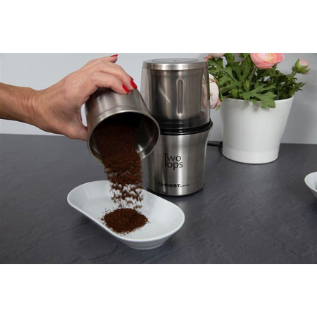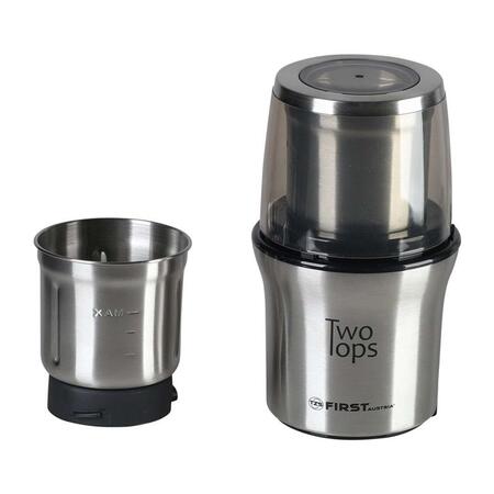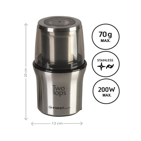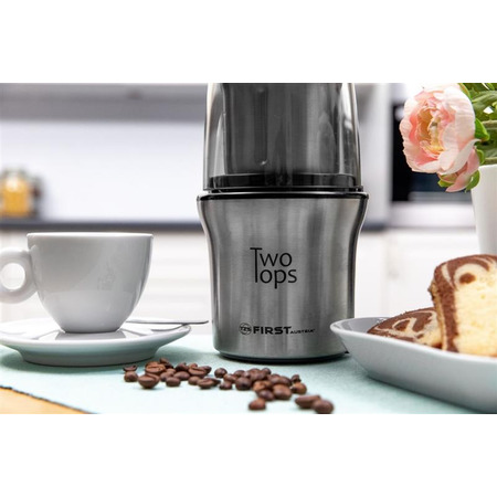Кавомолка First FA 5486 складається з корпусу з електромотором і двох невеликих чаш. Одна з них призначена для помелу кави, інша - для подрібнення продуктів. Молоти трави і спеції в чаші для помелу кави вкрай не бажано, оскільки їхній стійкий присмак буде підмішуватися до аромату кави і зіпсує його. З метою безпеки, кавомолка працює тільки за умови закритої кришки. Кришка виготовлена з прозорого пластику, що дає змогу контролювати процес помелу (подрібнення). Чаша для помелу кави оснащена дволопатевим ножем, а чаша чопера - чотирилопатевим. Ножі виготовлені з високоміцної нержавіючої сталі. Максимальний обсяг помелу - 70г. Цієї кількості достатньо, щоб приготувати 7-10 порцій еспресо. На нижній частині кавомолки розміщені прогумовані ніжки та відсік для намотування мережевого шнура. Ніжки забезпечують стійке положення приладу на гладкій поверхні столу або стільниці.