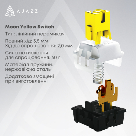 Клавіатура оснащена перемикачами Moon Yellow Switch, які забезпечують плавне та м’яке натискання з приємним відгуком. Кейкапи з PBT-пластику відзначаються підвищеною зносостійкістю та приємною текстурою.