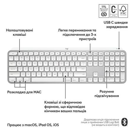 Клавіатура бездротова Logitech MX Keys S for Mac Pale Grey (920-011638) - це високоякісний і стильний інструмент, розроблений спеціально для користувачів пристроїв Mac. Основні характеристики цієї клавіатури включають: