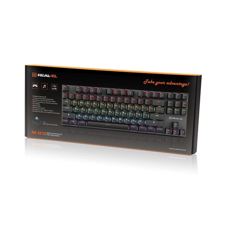 Висока надійність, швидкий час реагування, необмежена кількість одночасних натискань клавіш відрізняють механічну ігрову клавіатуру REAL-EL M 05. Дана модель обладнана різнокольоровим підсвічуванням з різноманітними комбінаціями, в кожній комбінації по 4 види підсвічування, які змінюються при повторному натисканні відповідної комбінації. Усього 20 видів підсвічування, що дозволяє створити на ігровому місці як агресивне середовище для онлайн-шутерів, так і атмосферу зосередження та концентрації для квестів та стратегій.