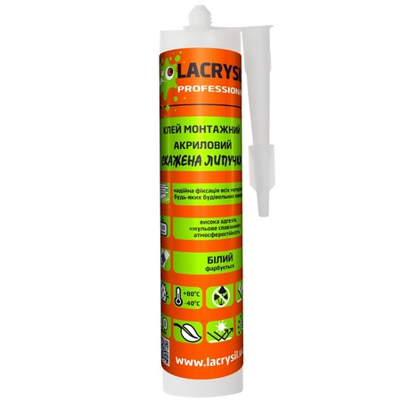 Клей "СКАЖЕНА ЛИПУЧКА" - це високоякісний однокомпонентний акриловий клей для настінних і підлогових покриттів з нульовим сповзанням. Продукт характеризується високою адгезією до всіх поверхонь. Після виcихання утворює водостійкий міцний клейовий шов. Витримує великі навантаження і деформації, забезпечує довговічність склеювання. Продукт є екологічно чистим і не містить розчинників. Виготовлений за європейськими стандартами якості. Універсальний монтажний клей на акриловій основі "СУМАСШЕДШАЯ ЛИПУЧКА" ТМ Lacrysil є унікальним продуктом і застосовується для робіт з усіма "складними" основами.