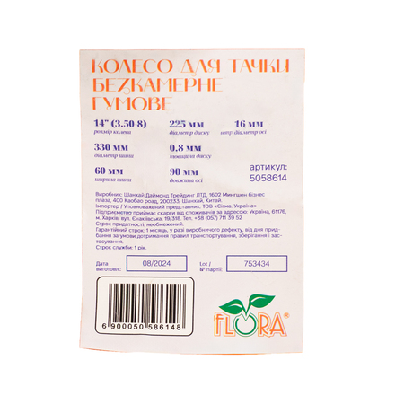 Колесо для тачки безкамерне гумове 14" (3.50-8) 330×60мм вісь Ø16мм довжина 90мм FLORA (5058614)