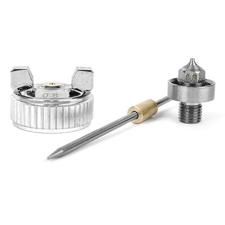 Набір форсунки PT-2002 використовується для заміни деталей фарбопульта, що вийшли з ладу, та дозволяє відновити його роботу. Діаметр форсунки 0,8 мм, підходить для фарбування невеликих деталей, тонування, використовується спільно з лакофарбовими матеріалами невеликої в'язкості. Цей комплект включає три важливі елементи: дюзу, повітряну головку та голку, надаючи повний інструментарій для якісного нанесення фарби.