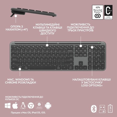 Не турбуйтеся щодо операційної системи вашого пристрою – підключайтеся через бездротовий зв’язок до Windows, macOS, ChromeOS, Linux, iPadOS, iOS та Android, клавіатура Signature Slim легко зможе з’єднатися з ним.