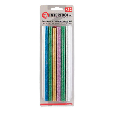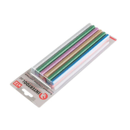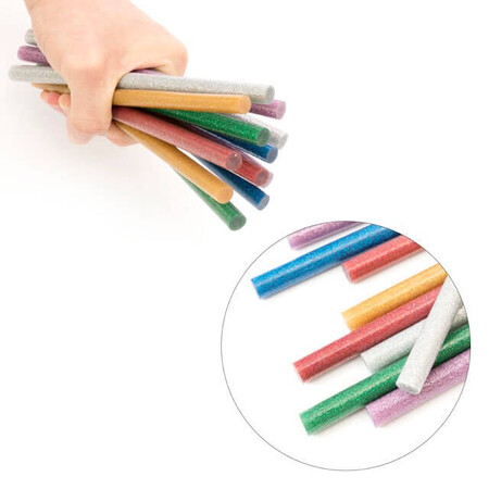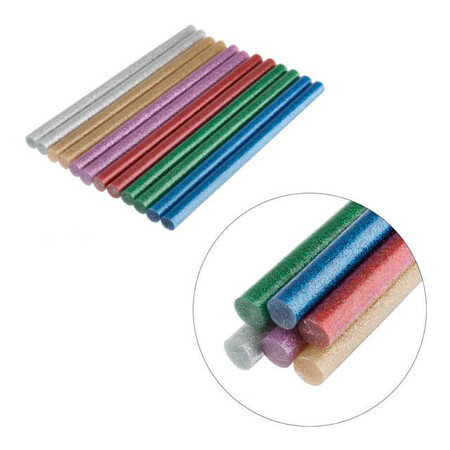 Кольорові клейові стержні з блискітками, в комплекті 6 кольорів: срібло, золото, червоний, бузковий, зелений, синій. Діаметр стрижня 7,4 мм - один із найпоширеніших і найпопулярніших розмірів, підходить до будь-яких марок клейових пістолетів. Сам стрижень довжиною 200 мм, в упаковці - 12 штук.
