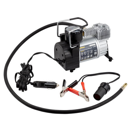 Компресор автомобільний автостоп 12В 180Вт 15А 35л/хв 10бар сумка, перехідник на клеми SIGMA (6170251) використовується для підкачки колес автомобіля. За допомогою перехідника від прикурювача на клеми і насадок, які поставляються в комплекті, ви можете підключити компресор безпосередньо до акумулятора і використовувати у побуті для накачування спортивного інвентарю.