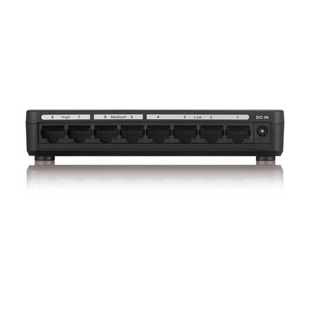 У Zyxel GS-108S v2 використовуються порти з QoS для призначення високого, звичайного і низького пріоритету для окремих мережевих додатків. Наприклад, для високоякісного відтворення голосу і мультимедіа можна підключити до портів з високим пріоритетом VoIP-телефон або мультимедіа-плеєр. Для участі в онлайнових іграх можна підключити ігрову консоль до порту QoS зі звичайним пріоритетом, а якщо вам потрібно тільки переглядати Web-сторінки на своєму ПК або ноутбуці, то підключіть комп’ютер до порту QoS з низьким пріоритетом.
