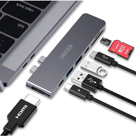Концентратор USB C 7-в-1 для MacBook: Оснащений 4K HDMI, порт Thunderbolt 3, порт USB Type-C, 2 порти USB 3.0, пристрій для карт пам’яті Micro SD/SD, цей концентратор USB типу C є відмінним розширенням для нового MacBook Pro/Air з обмеженою кількістю портів, безсумнівно, це зробили ваш офіс або життя набагато більше. Примітка: цей концентратор спеціально розроблений для MacBook Pro 2019/2018/2017/2016 та MacBook Air 2019/2018. Потужний порт Thunderbolt 3: порт Thunderbolt 3 підтримує вхідну потужність до 100 Вт, що дає вашому ноутбуку максимальну зарядку 87 Вт при підключенні периферійних пристроїв, а також надвисоку швидкість передачі даних до 40 Гбіт/с та відеовихід 5K@60 Гц. ; Крім того, він також сумісний із пристроями USB C, що підтримують передачу даних зі швидкістю 10 Гбіт/с та виведенням 4K на частоті 60 Гц. Примітка. Другий порт usb-c призначений лише передачі даних, а чи не для зарядки і виведення відео. Кришталево чистий вихід 4K HDMI: дзеркальне відображення або розширення екрану MacBook Pro/MacBook Air на телевізорі, моніторі або проекторі з роздільною здатністю до 4K UHD (3840 x 2160 при 30 Гц) через вихідний порт HDMI. Зворотна підтримка роздільної здатності 2K/1080p/720p/480p/360p. Універсальна підтримка Micro SD/SD: SD-картка та пристрій зчитування карток Micro SD можуть підтримувати високу швидкість передачі даних до 104 Мбіт/с, ємність до 2 ТБ; Підтримка SD, SDHC, SDXC, SD3.0 UHS-1. Легко переносити фотографії, зняті камери або відео з картки на ноутбук за лічені секунди. Мілковий та компактний дизайн: цей концентратор usb-c виготовлений з акуратного та гладкого алюмінієвого корпусу, він дуже міцний та міцний; Важить 1,4 унції, стильно тонкий та максимально портативний. Ідеально підходить для статичного використання та на ходу.