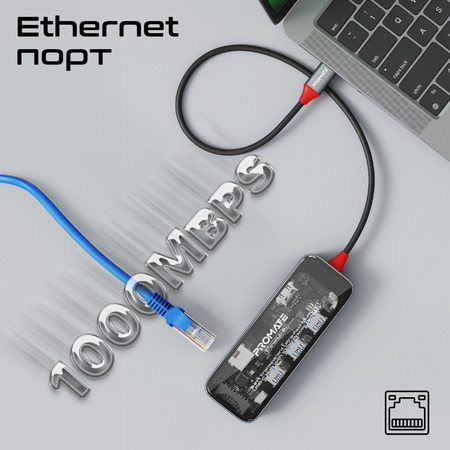 TransHub-Go - Type-C хаб із лінійки 2024 року від Promate. Широкий функціонал і максимальна стабільність у компактному та стильному корпусі з першокласних матеріалів. Особливості: - USB-C PD: Завдяки технології Power Delivery, хаб здатний приймати і передавати живлення від джерела на потужності до 100W - Зовнішній дисплей: Підключай монітор і виводь зображення з роздільною здатністю UltraHD 4K/60Hz 3840х2160 через HDMI порт - USB 3.0 + 2xUSB 2.0: 5 Гбіт/с і 0.9 А, або 480 Мбіт/с і 0.5 А відповідно. Вибирай оптимальну швидкість передавання даних і сили струму залежно від пристрою, що під’єднується - USB-С порт: Підтримує ефективну передачу даних зі швидкістю до 5 Гбіт/с - 1000 Мбіт/с RJ45: Гігабітний Ethernet порт забезпечить стабільне підключення до інтернету - Кардрідер: Підтримує SD і TF карти до 2ТВ - Безпечний: Вбудований захист від перевантаження за струмом, перенапруги та зворотного струму, а також підтримка гарячої заміни - Стильний дизайн: Прозорий корпус із металевою окантовкою дає змогу побачити всю начинку девайса - Plug & Play: Windows, Mac OS, iOS, Android. Не потребує встановлення програмного забезпечення або драйверів, тобі потрібен лише вільний USB-С порт (Type-C 3.1+ / Thunderbolt 3.0+)