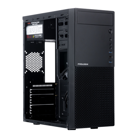 Оптимальна основа для збірки ПК — корпус Prologix E111 Black 450W. Виготовлений з листового металу завтовшки 0,4 мм, що надійно захищає компоненти від зовнішніх впливів. Бюджетна модель формату Miditower не займає зайвий простір і досить містка для монтажу всіх необхідних комплектуючих. Класичний дизайн елегантного чорного корпусу з сітковою перфорацією на бічній та фронтальній панелях, що забезпечує відмінну вентиляцію всередині корпуса. Два USB-порти 3.0 і роз’єм для під’єднання аудіогарнітури зручно розташовані на фасаді. Біля верхньої стінки корпусу вмонтовано фірмовий блок живлення потужністю 450 Вт.