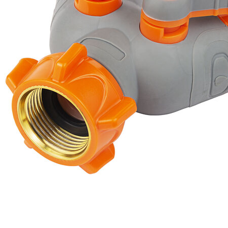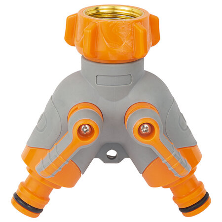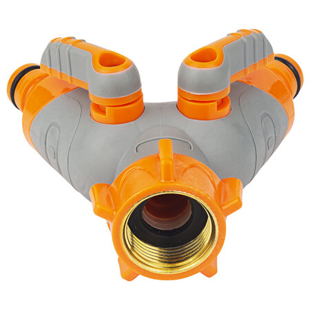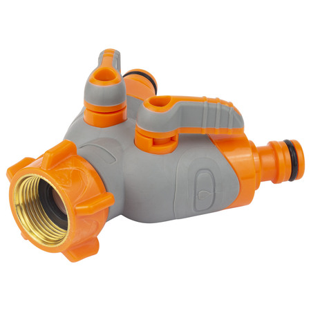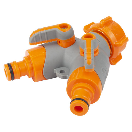 Кран розподільний з адаптерами ½" 2 виходи на кран ¾" з латунованим різьбленням (ABS+TPR) FLORA (5016614) призначений для одночасного підключення двох водозабірних ліній до садового крану або труби із зовнішнім різьбленням діаметром 3/4".