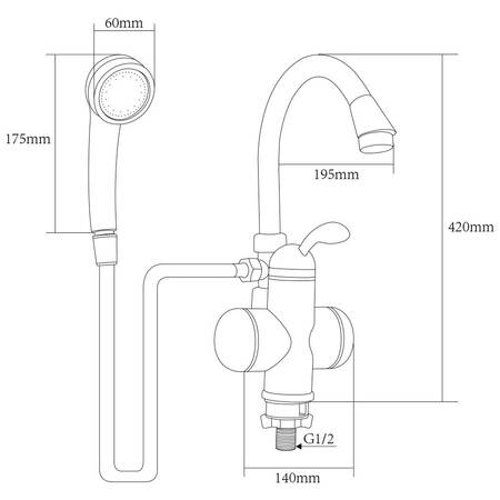 Цей проточник складається з термостійкого білого корпусу з нагрівальними елементами, душового шланга з дворежимної лійкою, поворотного J-образного виливу з аератором, а також важеля регулятора натиску і температури нагріву струменя.