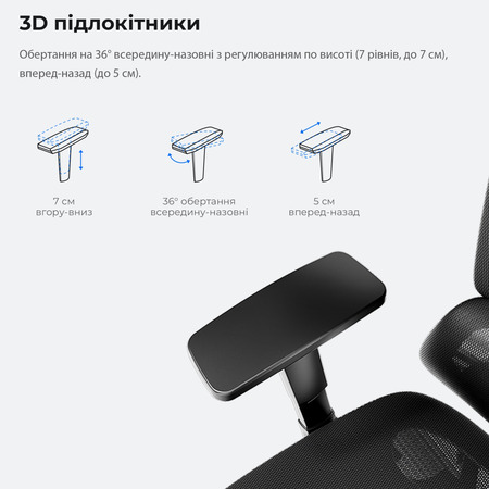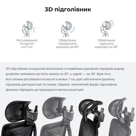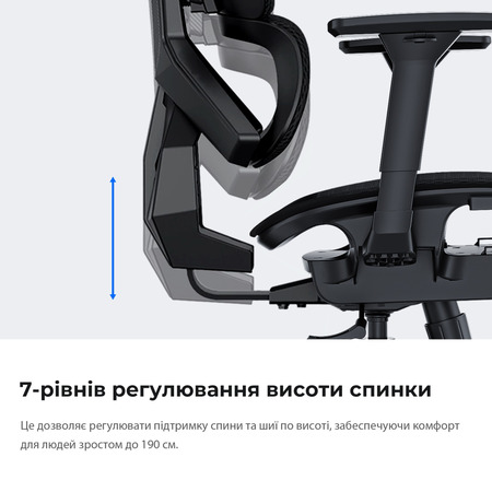 Крісло оснащене 4D підлокітниками, 3D підголівником та 8-сантиметровим регулюванням висоти спинки з 7 рівнями, що дозволяє налаштувати комфорт та підтримку відповідно до ваших потреб.