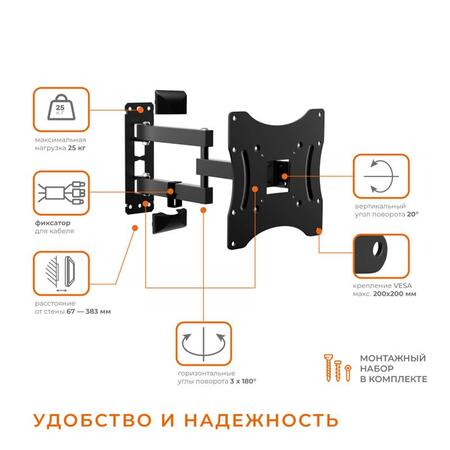 Зручний і сучасний кронштейн, призначений як для телевізорів, так і для моніторів, підтримує VESA. Здатний витримати вагу до 25 кг, підтримує телевізори та монітори з діагоналлю 26-42 дюйми, швидке навішування, легкий у використанні. У комплекті з кронштейном ви знайдете: рівень для рівного встановлення кронштейна, органайзери для кабелів телевізора або монітора, кріплення для монтажу та інструкцію щодо експлуатації продукції.