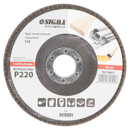 Круг пелюстковий торцевий Т29 (конічний) Ø125мм P220 SIGMA (9172691) призначений для плоского шліфування, обробки кромок зварних швів деталей і конструкцій з різних марок сталей, кольорових металів і деревини. Конічна форма тарілки і кут нахилу пелюсток дозволяє поліпшити якість і швидкість обробки матеріалу.