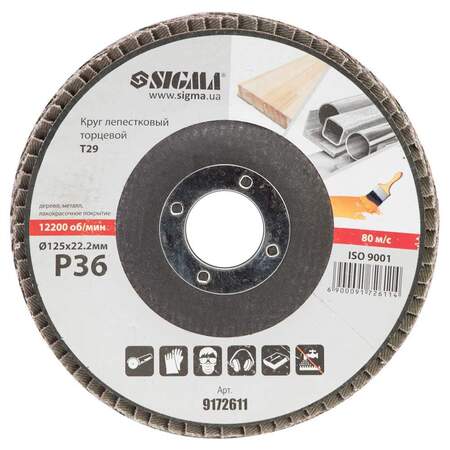 Круг пелюстковий торцевий Т29 (конічний) Ø125мм P36 SIGMA (9172611) призначений для плоского шліфування, обробки кромок зварних швів деталей і конструкцій з різних марок сталей, кольорових металів і деревини.