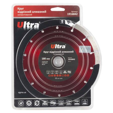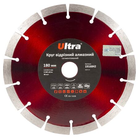 Круг відрізний алмазний сегментований Ø180×22.2мм ULTRA (1916842) призначений для різання бетону, граніту, цегли, каменю, черепиці, асфальту та інших будівельних матеріалів без примусового охолодження. Корпус виготовлений із міцної сталі, здатної витримати значні механічні навантаження ти високу температуру. Добре збалансована основа зменшує вібрацію на інструмент та забезпечує високу надійність під час експлуатації.