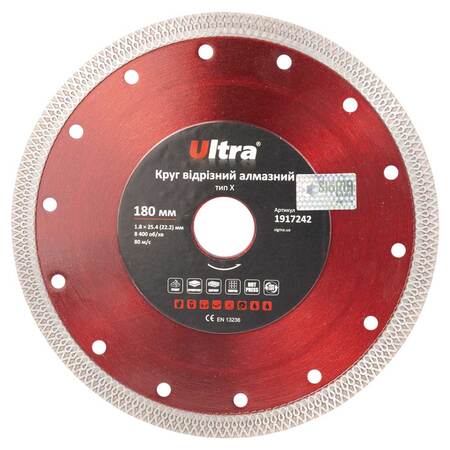 Круг відрізний алмазний тип Х Ø180×25.4 (22.2)мм ULTRA (1917242) призначений для різання потовщеного граніту та керамограніту, кахлю, плитки, мармуру. Корпус виготовлений із міцної сталі, здатної витримати значне механічне навантаження та високу температуру.