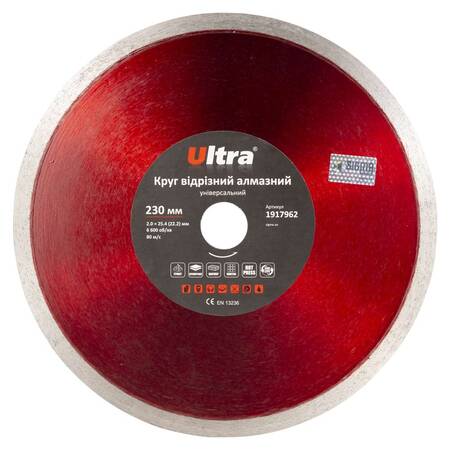 Круг відрізний алмазний універсальний Ø230××25.4 (22.2)мм ULTRA (1917962) призначений для різання граніту та керамограніту, кахлю, плитки, мармуру, каменю з примусовим охолодженням. Корпус виготовлений із міцної сталі, здатної витримати значне механічне навантаження та високу температуру. Добре збалансована основа зменшує вібрацію на інструмент та забезпечує високу надійність під час експлуатації.