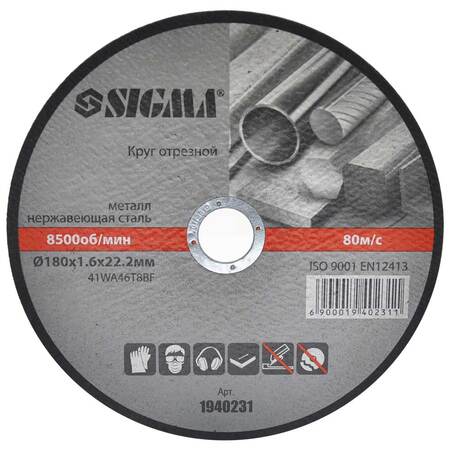 Круг відрізний по металу та нержавіючої сталі Ø180×1.6×22.2мм, 8500об/хв SIGMA (1940231) призначений для різання виробів з металів і нержавіючої сталі, роботи з кузовной сталлю і іншими аналогічними матеріалами. Робочим інструментом при роботі відрізного круга є кутова шліфувальна машина (КШМ, "болгарка").
