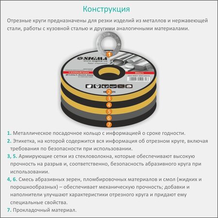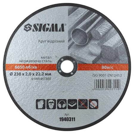 Круг відрізний по металу та нержавіючої сталі Ø230×2.0×22.2мм, 6650об/хв SIGMA (1940311) призначений для різання виробів з металів і нержавіючої сталі, роботи з кузовной сталлю і іншими аналогічними матеріалами. Робочим інструментом при роботі відрізного круга є кутова шліфувальна машина (КШМ, "болгарка").