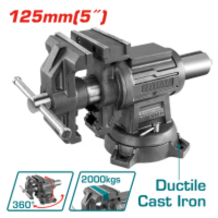Слюсарні лещата з ковадлом TOTAL THTMF6156 служать для фіксації невеликих заготовок. Модель має функцію повороту для зручності використання. Корпус виконаний із чавуну високої міцності. Широке ковадло дозволяє проводити обробку молотком. Рельєфні сталеві губки забезпечують надійний затиск деталей. Максимальна сила затиску - 2000 кгс. Вага - 19.5 кг.