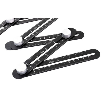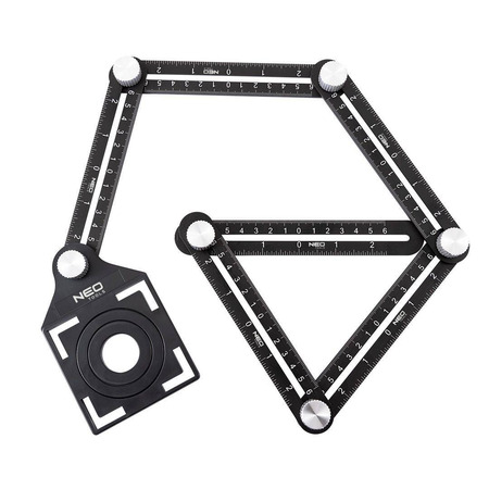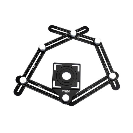 Лінійка Neo Tools кутова з алюмінію, яка має 6 плечей та шкалу від 0 до 6 см. Також вона має отвори у шаблоні розмірами 2.5 см, 4 см та 4.5 см. Ця лінійка може бути корисним інструментом для вимірювання та маркування у різних видів робіт, таких як будівництво, ремонт, меблевий дизайн та інше.