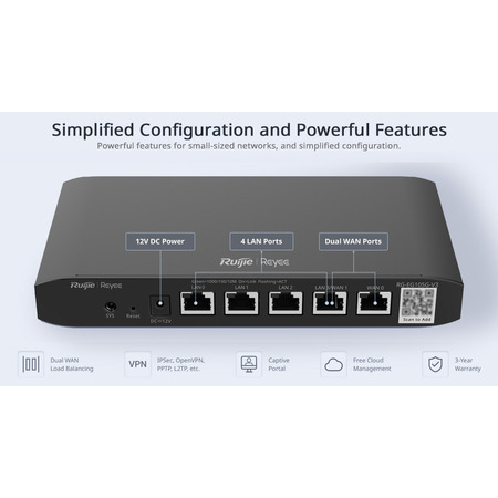 Ruijie Reyee RG-EG105G-P V3 забезпечує багато функціональних можливостей, які значно спрощують його використання. Уніфіковані функції з оновленим флеш-пам'яттю дозволяють користувачам не стикатися з проблемами сумісності. Зручна конфігурація та простота використання роблять цей роутер ідеальним вибором навіть для тих, хто не має глибоких технічних знань. Наприклад, налаштування VPN з підтримкою PPTP, L2TP, IPsec та OpenVPN дозволяє безпечно переглядати Інтернет та взаємодіяти з локальними мережами віддалено.