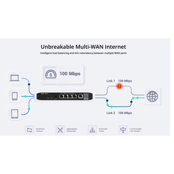 Додатково, цей роутер має високу надійність і ефективне балансування навантаження через порти WAN, що дозволяє розподіляти трафік і запобігати перевантаженню мережі. Також варто відзначити актуальну для багатьох користувачів функцію блокування небажаних додатків з бібліотекою, що автоматично оновлюється, що забезпечує додатковий рівень контролю над використанням мережі. Можливість налаштування сторінки порталу в режимі WYSIWYG робить процес керування мережею ще більш інтуїтивним.
