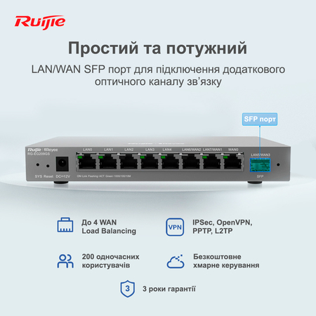 Ruijie Reyee RG-EG209GS - це бездротовий маршрутизатор, який пропонує широкі можливості та просте використання для ефективного бездротового підключення. Основні особливості цього маршрутизатора наступні: