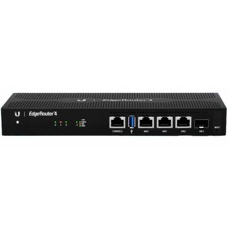 Інженери компанії Ubiquiti порадували нас поповненням у популярній лінійці корпоративних маршрутизаторів, випустивши на ринок новоспечений EdgeRouter 4. Пристрій являє собою потужний, але водночас дуже компактний гігабітний роутер із підтримкою оптичних каналів зв'язку. EdgeRouter 4 обладнаний трьома портами RJ45 Ethernet 100/1000, одним гігабітним SFP портом і консольним портом RJ-45. Новинка побудована на базі нової платформи з потужним чотирьохядерним процесором MIPS64 архітектури. Об'єм оперативної пам'яті становить 1 Гбайт, крім того, є 4 Гбайти вбудованої FLASH пам'яті eMMC. Така апаратна начинка забезпечує маршрутизатору чудову продуктивність (обробка 3.4 мільйона пакетів на секунду) і значно розширює сферу його застосування.