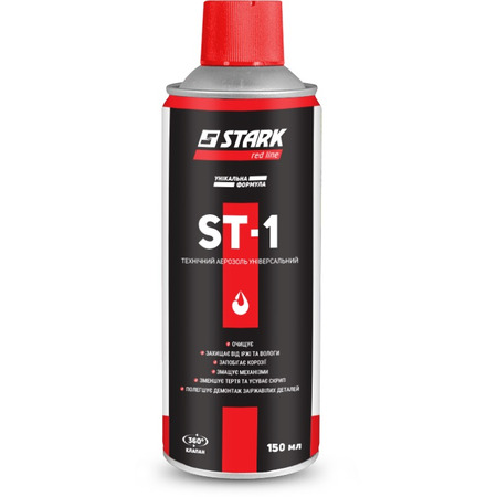 Аерозоль універсального призначення Stark ST-1 150мл. Придатний як для побутового, так і для професійного використання. Не містить силікону, тому не залишає жирні плями та не створює липку плівку. Захищає від вологи та перешкоджає утворенню корозії. Особливості продукту: Зручність використання. Оснащений клапаном 360°, що дозволяє використовувати балон у любих положеннях. Універсальність. Використовується для змащення іржавих деталей, проникаючи всередину механізму, полегшує демонтаж, сприяє роз’єднанню вузлів, що заклинили. Знижує знос рухомих деталей. Видаляє жир, залишки клею та старе мастило. Змащує механізми та зменшує тертя.