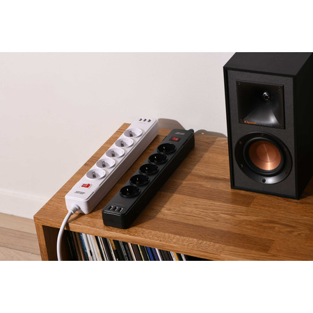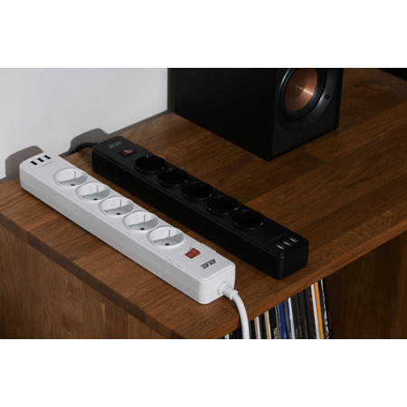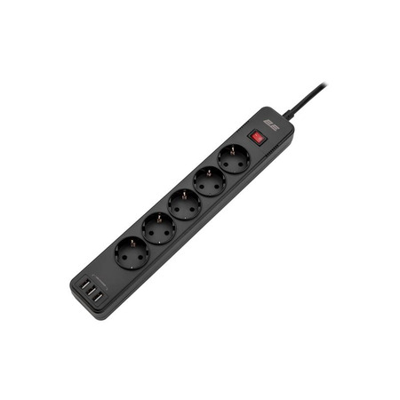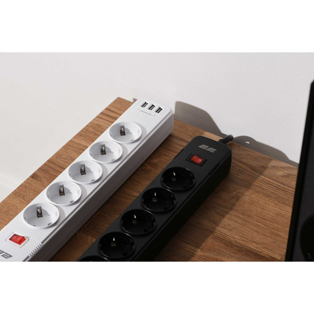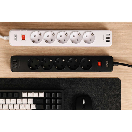 Мережевий фільтр 2E має п’ять розеток, розташованих під кутом 45°, щоби вилки пристроїв не заважали одна одній. Для заряджання мобільних пристроїв передбачено три розніми USB-A: 2 x 5 В, 3,4 A; 1 x 5 В, 2,4 A. Корпус виготовлений з вогнетривкого PC-пластику, що забезпечує високу термостійкість та запобігає виникненню пожежі. У кабелі мережевого фільтра ізольована кожна жила: трижильний H05VV-F із перерізом 1,5 мм. Матеріал провідника – 100 % мідь. Саме ці особливості зумовлюють допустиме максимальне навантаження на пристрій 3 680 Вт. Максимальна поглинаюча енергія фільтра становить 350 Дж.