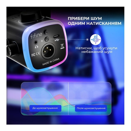 FIFINE AM9 — гібридний динамічний мікрофон із підтримкою USB і XLR, що підходить для ПК, Mac, PlayStation і мікшерів. Він має активне шумозаглушення, яке одним натисканням прибирає фонові шуми, забезпечуючи чистий звук. Зручний мікшер дозволяє регулювати баланс між ігровим звуком і голосом, а окремий контролер гучності навушників — чути себе в реальному часі. Сенсорна кнопка MUTE та RGB-підсвічування додають комфорту й стилю. Завдяки Type-C підключенню «plug and play», FIFINE AM9 готовий до роботи одразу після підключення — ідеальний для стрімерів, геймерів і подкастерів.